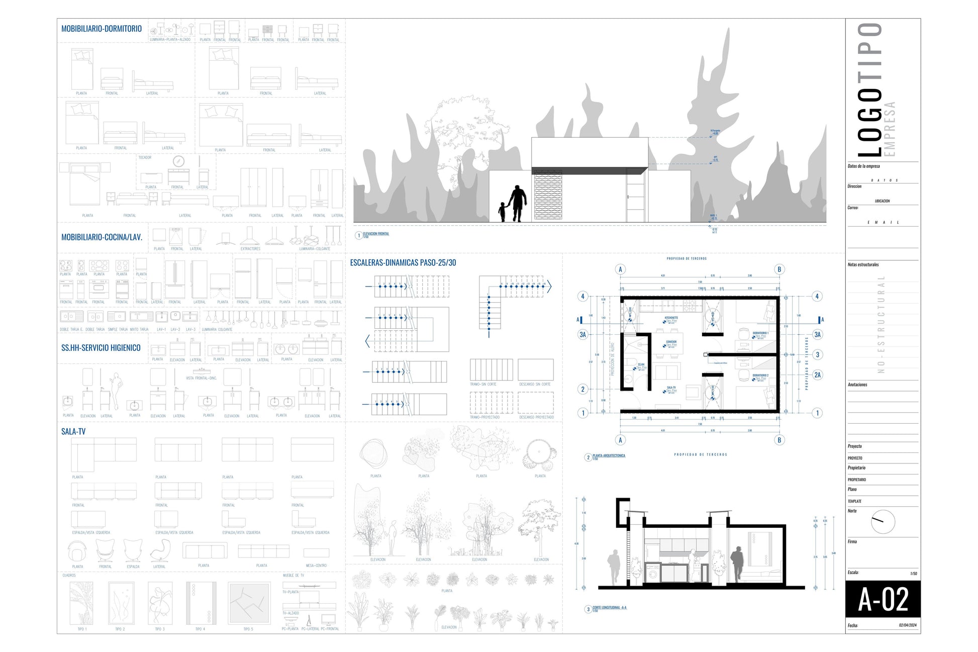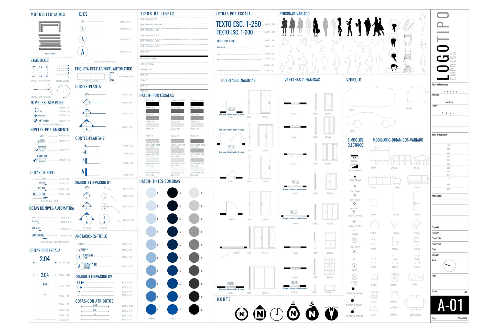 - Símbolos dinámicos: Cotas, ejes, niveles, elevaciones automáticas, detalles de secciones y escalas.