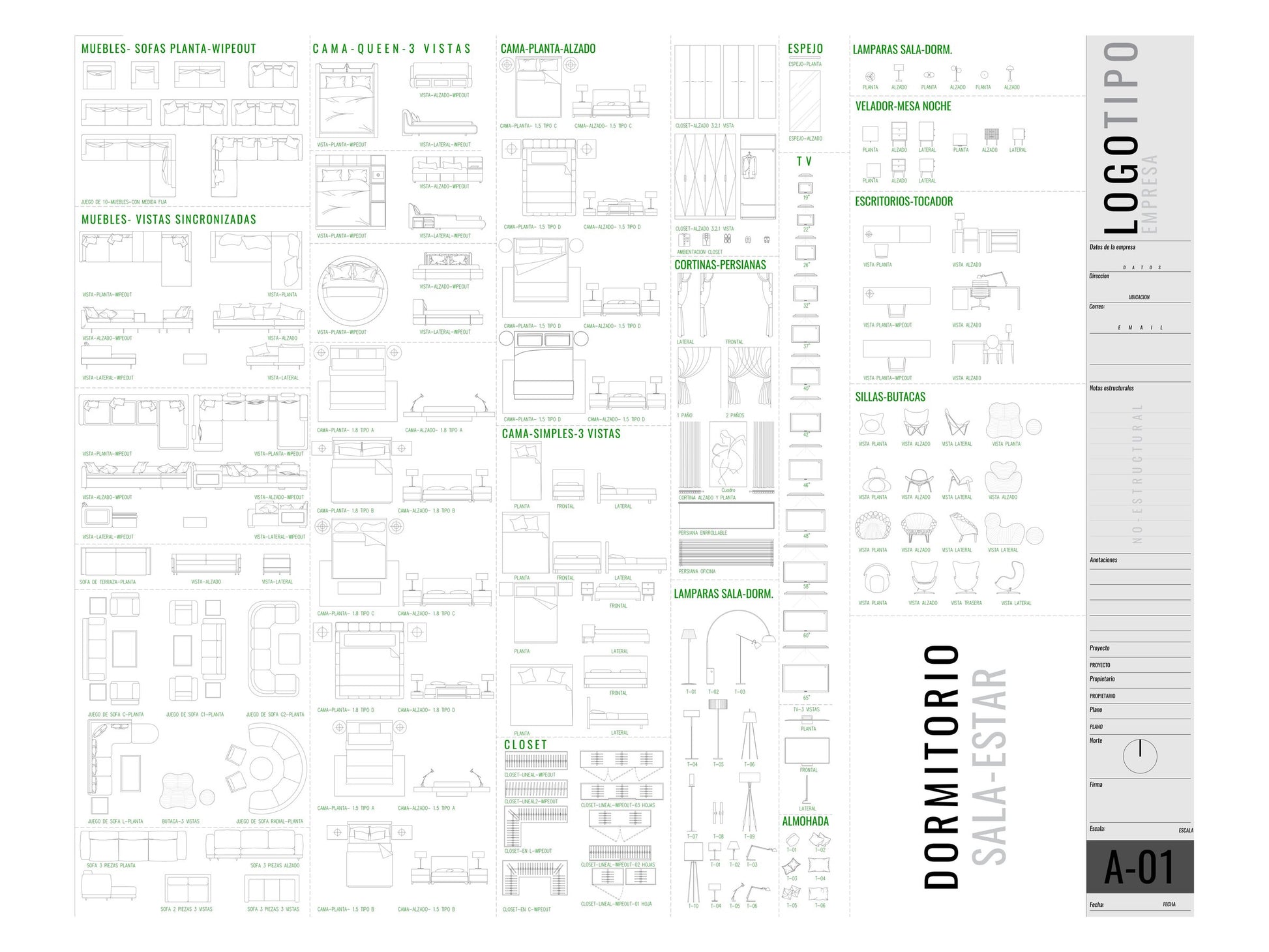 - Bloques dinámicos de mobiliario: Cocina, dormitorio, sala de estar, baños, y más.